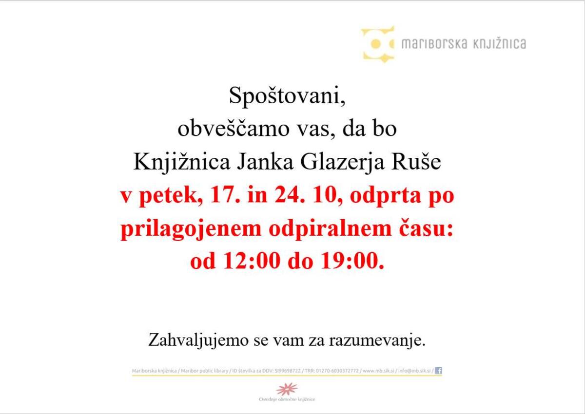 Obvestilo Knjižnice Janka Glazerja Ruše